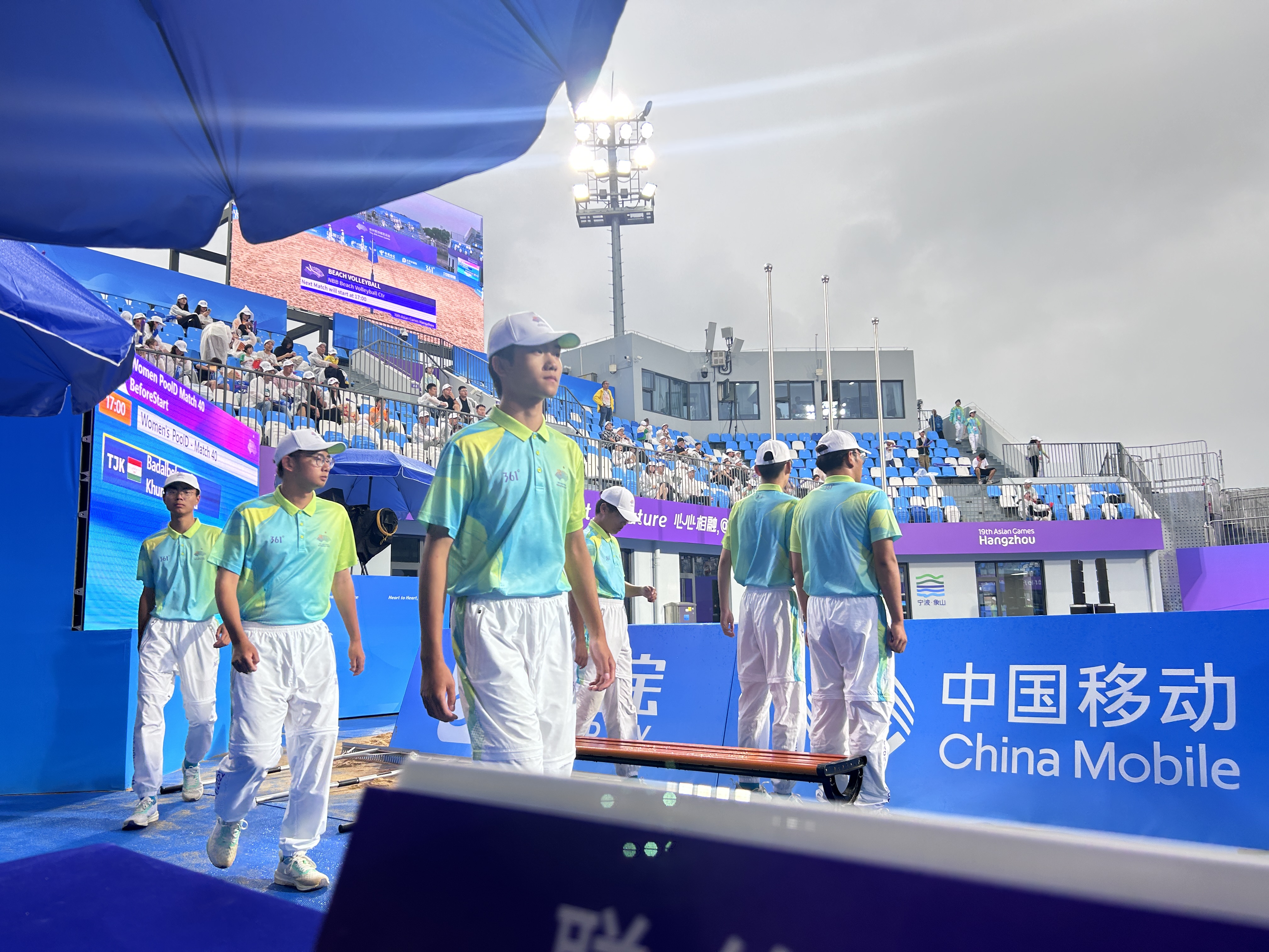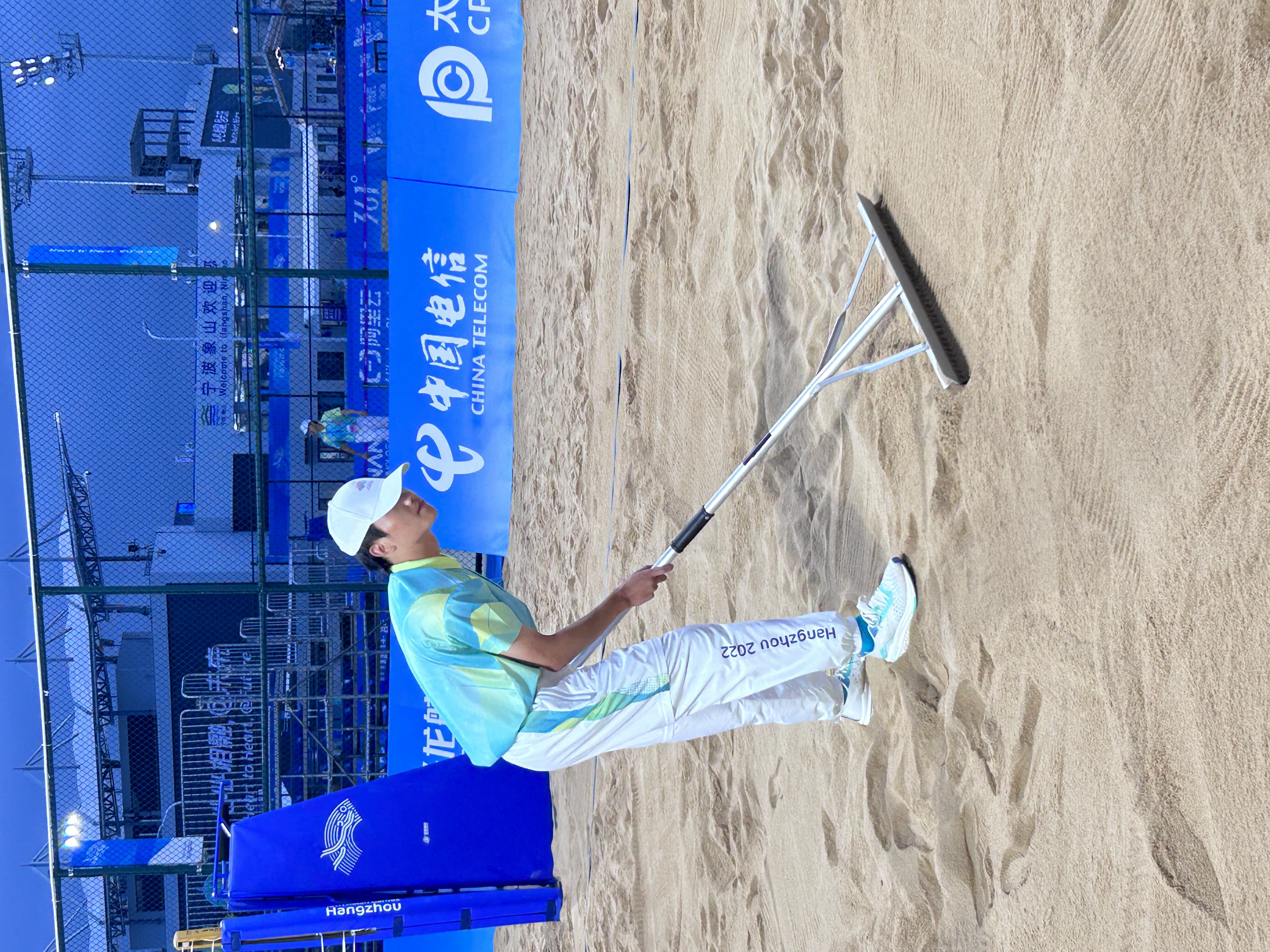 “还有就是要快,平沙员要在有限的时间内完成任务。每场比赛在技术暂停或运动员请求暂停时,我们就要迅速的冲向场地进行平沙。每次只有30秒左右的时间。”王刚说,在这过程中他们还要做到全程状态饱满,克服沙地扬沙进入眼睛和防止摔跤。“真的是要眼观四方,手快如风。”
