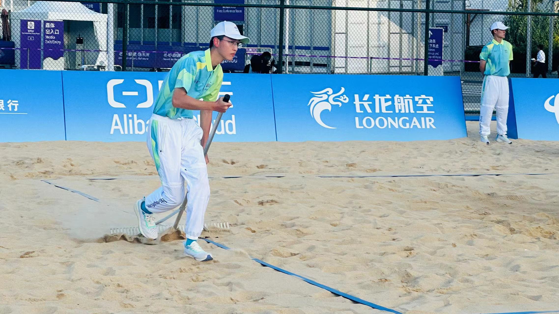 随着对局结束的哨声响起,早在一旁待命的王刚和其他平沙员们就抄起平沙耙,迅速将坑洼的沙地整理平整,这个动作他一天要顶着烈日重复40多次。