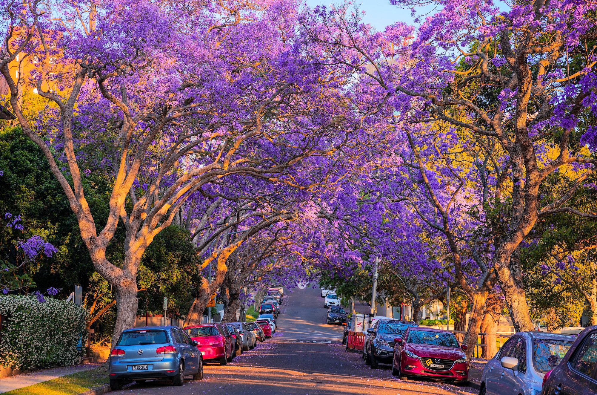 旅途从城市中心开启,第一天从悉尼开向海港郊区基里比利(Kirribilli),沿着麦道嘉尔街(McDougall Street)行驶,可以看到一道紫色花朵装饰的拱门。饱览了这座城市的淡紫色烟雾之后,从悉尼驱车6小时赶往田园,向北前往位于克拉伦斯山谷(Clarence Valley)的格拉夫顿(Grafton)。在这里,1700棵蓝花楹树上盛开和飘落的花瓣让街道和公园呈现出一片紫色的景象。这个花期出奇的短:通常在10月中旬到11月中旬,这里会变成紫色的世界。