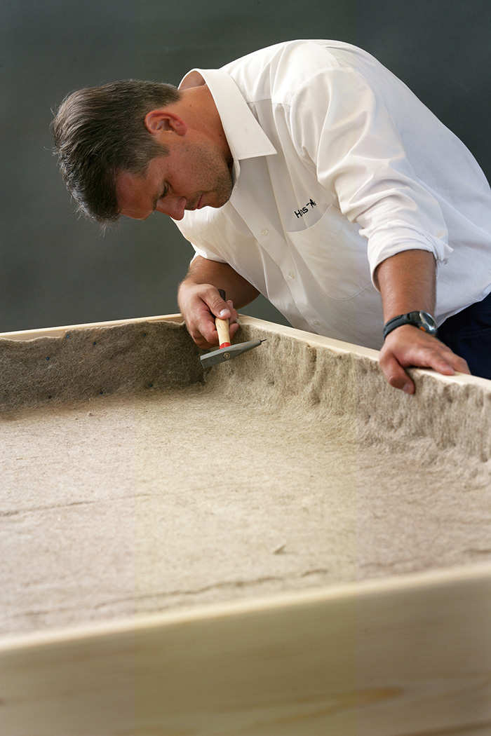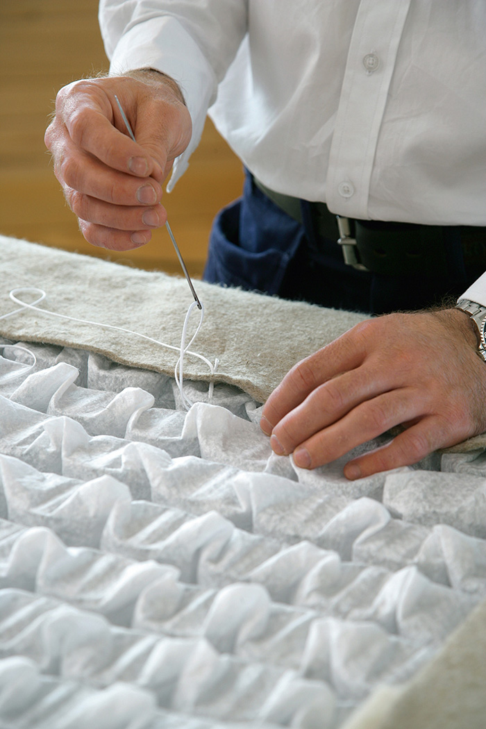 床垫是床具的核心,也是睡床中手工技艺的核心。手工制作床垫并非为了抬高其身价,它的奥义在于高端床垫中使用的天然材质,必须在平整、均匀地层层铺放时才能发挥最大的舒适度,这种高度精确的工作只有经验丰富工匠用双手才能完成。