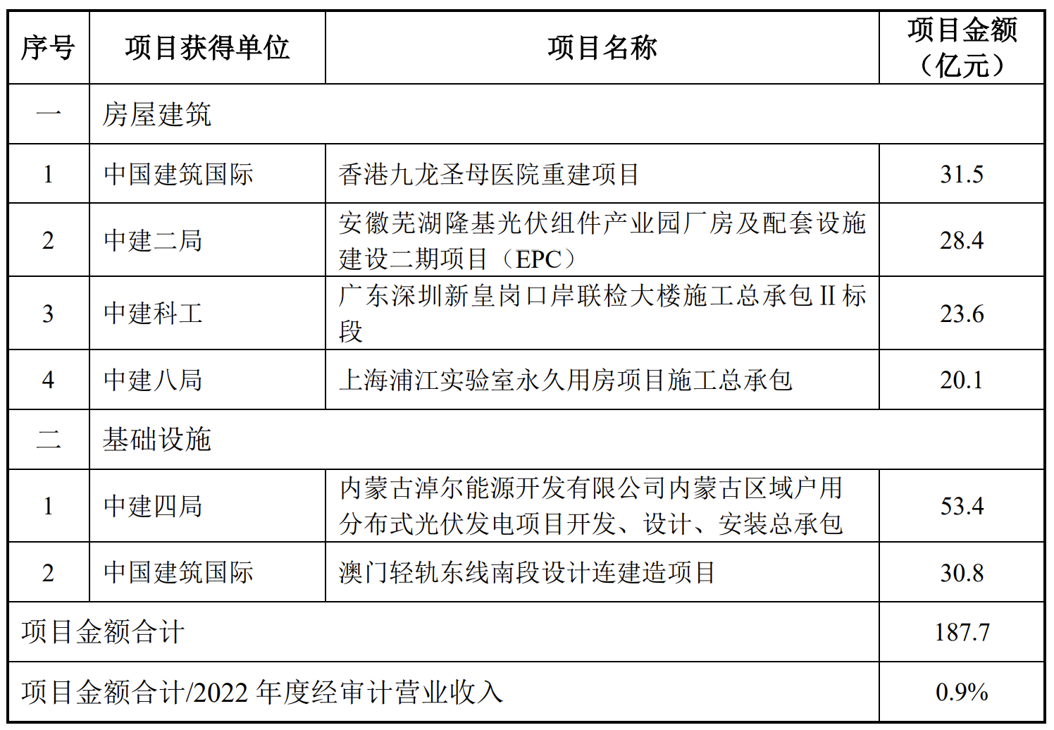 中国建筑9月27日公告,近期获得香港九龙圣母医院重建项目、安徽芜湖隆基光伏组件产业园厂房及配套设施建设二期项目(EPC)等6个重大项目,项目单位包括中国建筑国际、中建二局等,项目金额合计187.7亿元,占2022年度经审计营业收入的0.9%。