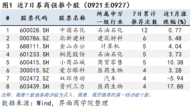 上图将券商近7日(9月21日至9月27日)推荐的个股按被推荐次数由高到低排序。共有63只个股得到券商周内多次推荐。其中中国石化(600028.SH)在过去一周得到12家券商的集中推荐。