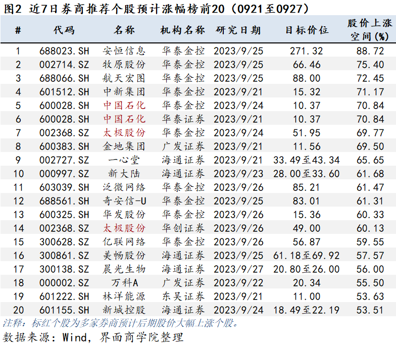 上图将券商近7日(9月21日至9月27日)推荐的个股按预期股价上涨空间由高到低排序,股价上涨空间计算基数均以最新交易日收盘价为准,其中券商目标价通常指未来3至6个月券商预测目标价。其中,华泰金控预测安恒信息(688023.SZ)股价后续上涨空间为88.72%。