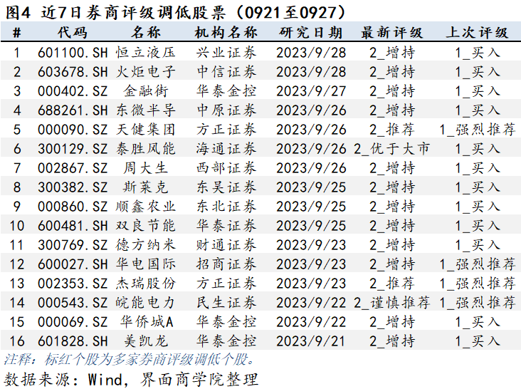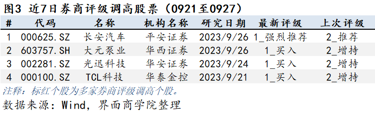 券商对上市公司的观点通常保持连贯一致,但当市场情况或公司基本面发生较大改变,券商对上市公司判断发生改变时会调整相应的公司评级。上图为券商个股在过去一周的评级上调情况,按研报日期排序。券商评级数字为1即为第一档,即最佳,5为最末档,即最差。由于各券商对评级的文字描述不尽相同,所以评级调整以评级数字为准。