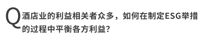王永刚:一般而言,酒店业会涉及到业主方、管理方、员工、客人、社区与政府等多重利益相关者,从企业的角度来看,利润导向无需多言也不必质疑,但是ESG建设与企业的长期利益并不相悖。事实上,ESG已经被越来越认可为酒店业“非财务价值”的缔造者,它可以帮助酒店业提升全面管理水平和中长期发展潜能。这一作用,对于上述利益相关者而言,都是喜闻乐见的——ESG不应被视为成本费用项,而是表外资产的建设。