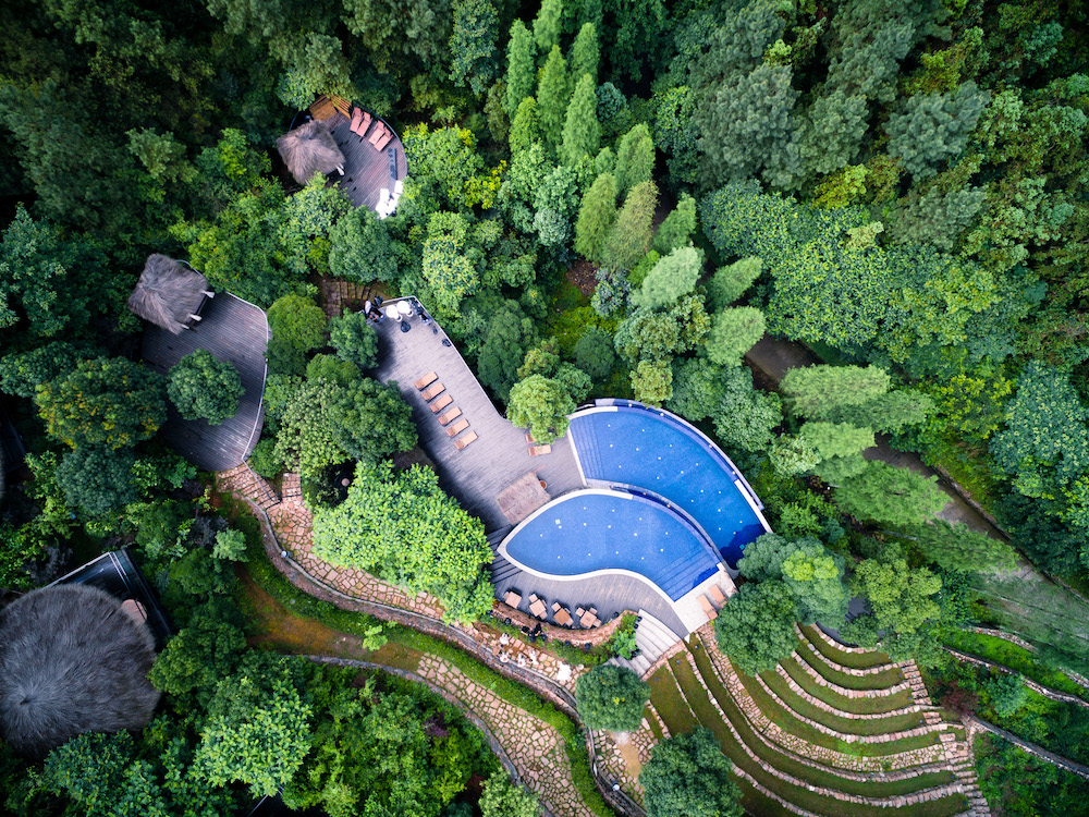 以环境层面为例 ,裸心度假村的选址一定在自然地貌特别的地点,无论是莫干山的裸心谷, 裸心堡,苏州太湖的裸心泊,南京无想山的裸心岭等无一例外。而裸心的设计工作室,在建筑、室内景观设计时一定是因地制宜,巧妙地将设计融于自然,裸心谷的户外恒温泳池从空中俯瞰泳池宛若两片造型优雅的树叶,隐在莫干山的苍翠松林中,与自然毫不违和。