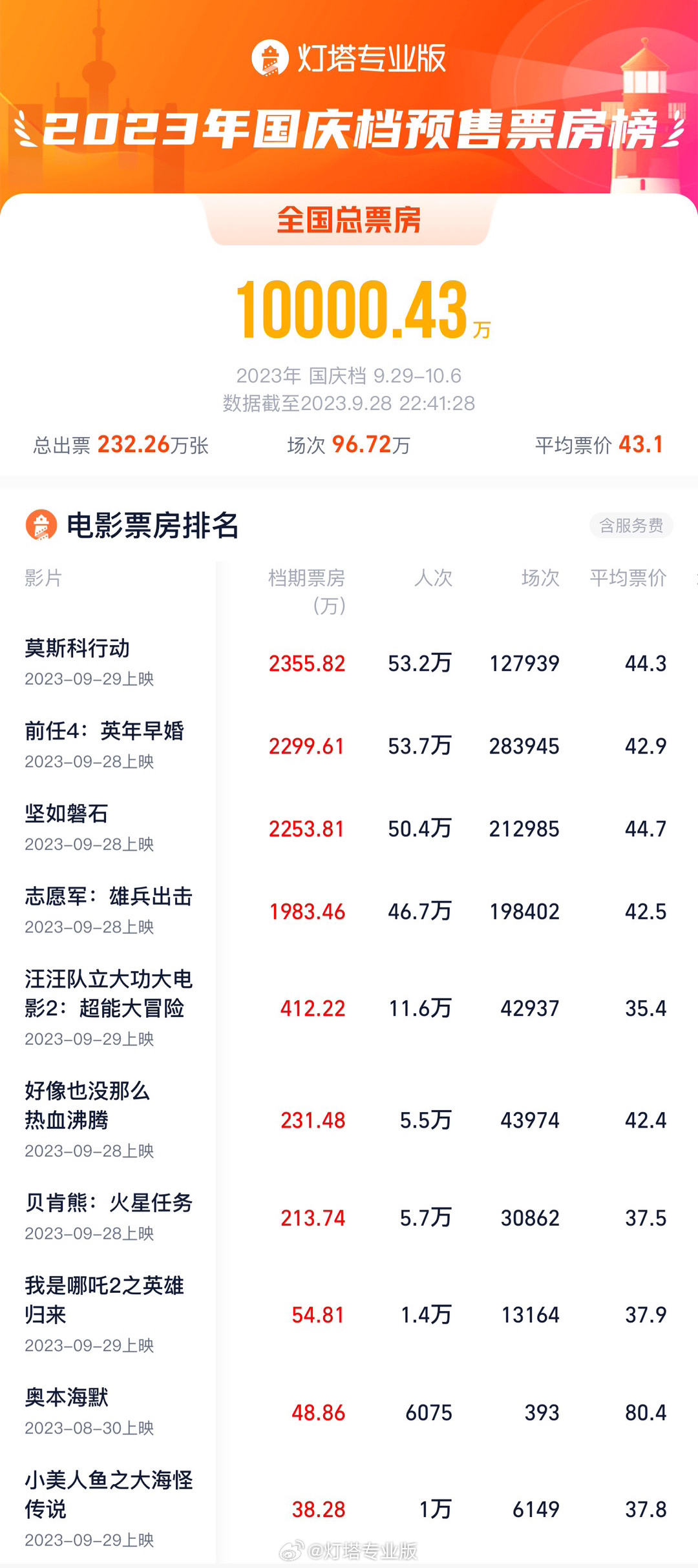据灯塔专业版,截至9月28日22时41分,2023国庆档(9月29日-10月6日)预售总票房突破1亿元,《莫斯科行动》《前任4:英年早婚》《坚如磐石》暂居当前档期票房前三位。