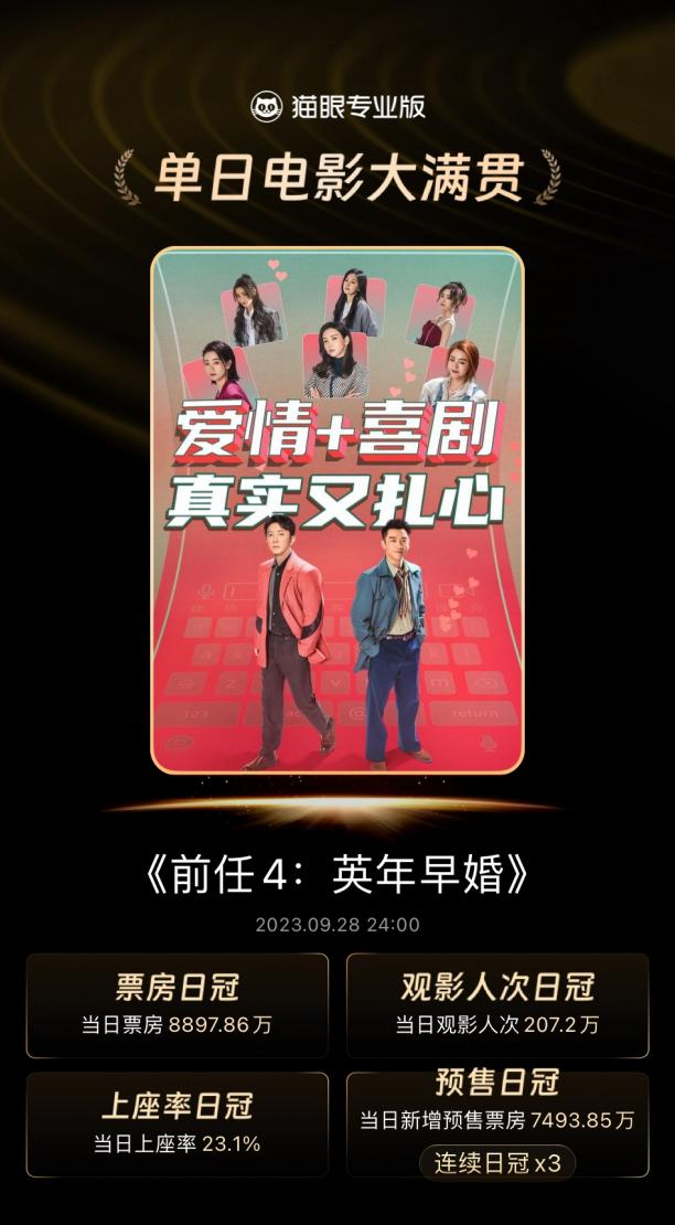与《坚如磐石》靠口碑逆袭不同的是,国庆档热门影片《前任4:英年早婚》在上映第二天日票房为9959万,票房下跌至第二名,日观影人次为231.4.万,相比首映日上升18.8万,基本维持住首日热度。该影片上映前便收获179万+的想看新纪录,在首日便收获9110.9万票房,成为上映首日大满贯电影,收获票房日冠、观影人次日冠、上座率日冠、预售日冠等多项日冠。但伴随而来的口碑并没有跟上连续两天的排片冠军,大部分观众反映影片剧情无聊、过于平淡,远远没有前任3的内容优质,同时前任3电影也借助了《体面》《说散就散》两首大热电影OST的热度,但今年前任4在音乐方面暂未有亮点,同时目前也未出现热门的话题点。