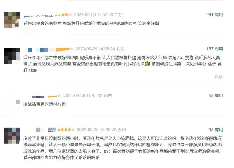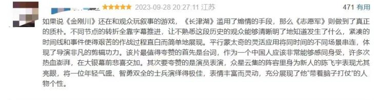作为今年国庆档唯一一部献礼片,《志愿军:雄兵出击》国庆档首日票5965.54万,国庆档首日观影人次140.6万,累计票房8687.5,位列国庆档第三,上映首日收获2697.5万票房。但值得一提的是猫眼评分9.7,位列国庆档影片第一,借助首映后观众的好评,第二天票房与观影人次相比上映首日均有显著上升,超首映日票房3268.04万。