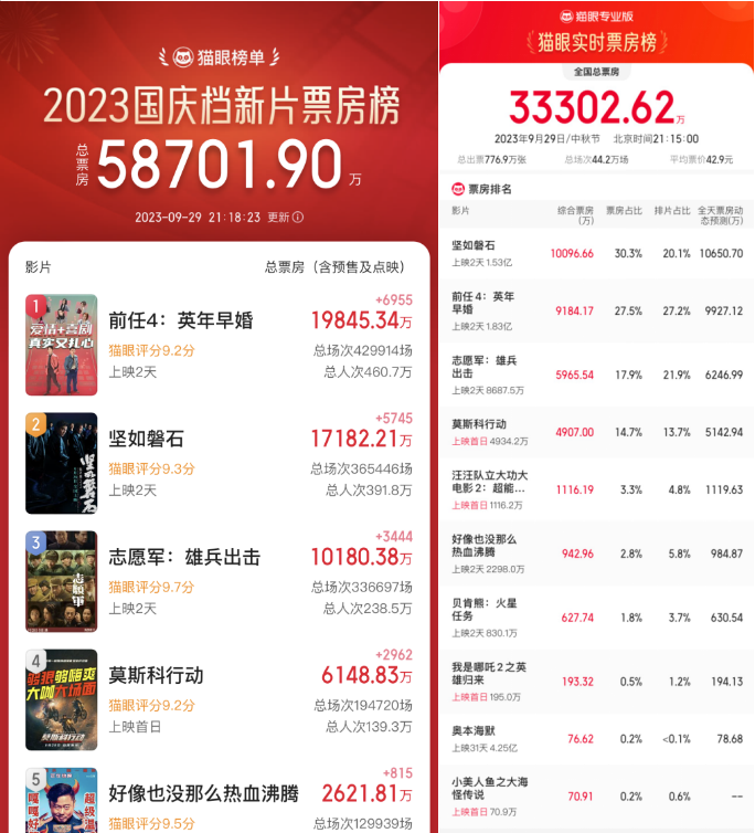 据猫眼专业版,截至9月29日21时15分,2023年国庆档影片票房累计破5.87亿,累计观影人次达941.7万人次。9月29日国庆档首日观影人次776.9万人次,票房3.33亿元,票房榜前三电影分别是《前任4:英年早婚》(1.83亿)《坚如磐石》(1.53亿)《志愿军:雄兵出击》(8687.5万)。