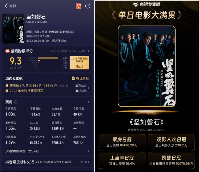 《坚如磐石》上映第2天,逆袭领跑国庆档首日票房,截至9月29日21时,今日观影人次达151.6万,日票房达1.20亿,猫眼评分9.3。作为张艺谋今年上映的第二部执导影片,《坚如磐石》在9月28日首映时收获5189.2万,位列当日票房榜第二,上映第二天日观影人次超首映日32万,票房超6786.8万,反超《前任4:英年早婚》。目前《坚如磐石》票房涨幅速度已升至国庆档第一,场均人次及上座率也位列第一,预计国庆档期间排片会反超《前任4:英年早婚》。