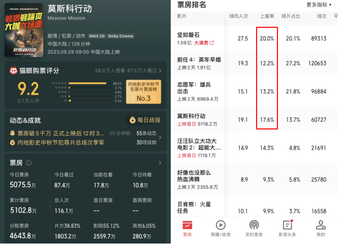 作为国庆档前想看热度第三的《莫斯科行动》今日首映。首日票房5075.52万,位列今日国庆档票房总榜第四,首日观影人次116万,猫眼开分9.2。上映首日上座率为17.5%,位列今日影片上座率第二,距第一名《坚如磐石》差2.4%,超第三名《志愿者:雄兵出击》4.4%。