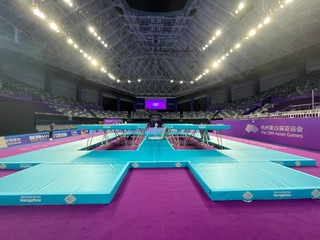 很多观众不知道的是,此次亚运会蹦床项目的比赛场馆黄龙体育中心,在几日前还是竞技体操馆。