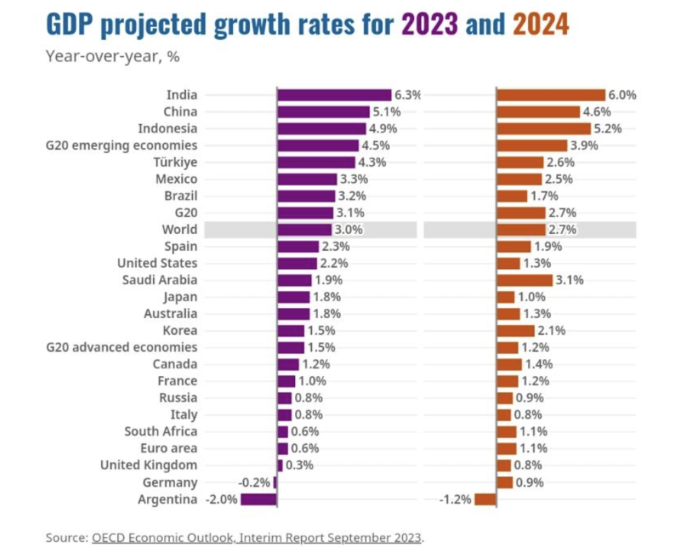 经合组织9月最新的经济展望报告中,德国今明两年的GDP增长率分别为-0.2%和0.9%,同样位列主要经济体末尾,仅优于正处于恶性通胀漩涡的阿根廷。