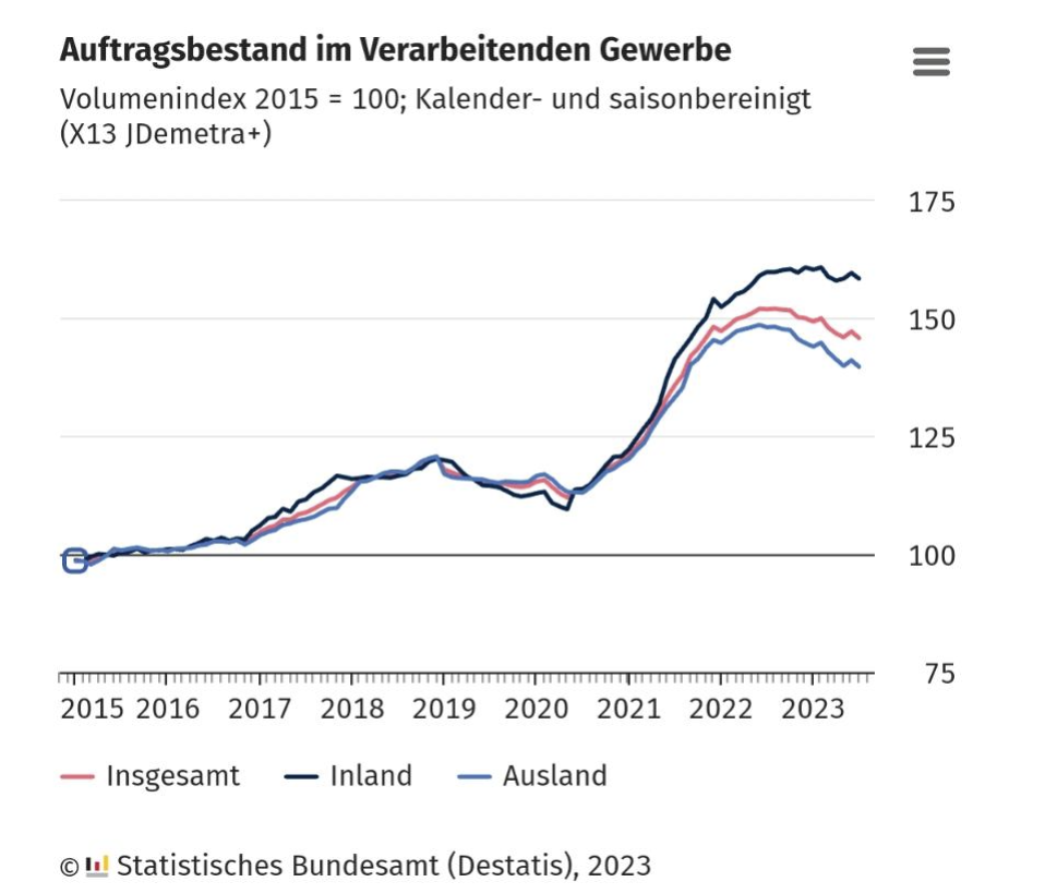 尤其是在德国最引以为傲的制造业,全球需求不振带来的新增订单更加明显。