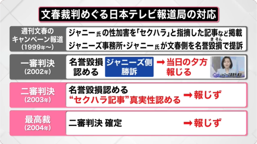 据NTV NEWS报道,此前已故的杰尼斯创始人喜多川(Johnny H. Kitagawa)早在1999年就被日本《文春周刊》新闻周刊指控性侵旗下艺人及练习生,但在当时介于杰尼斯对娱乐产业的垄断地位,没有媒体愿意报道此事,甚至《文春周刊》被杰尼斯以污蔑诽谤名义告上法庭要求赔偿,最终《文春周刊》败诉。