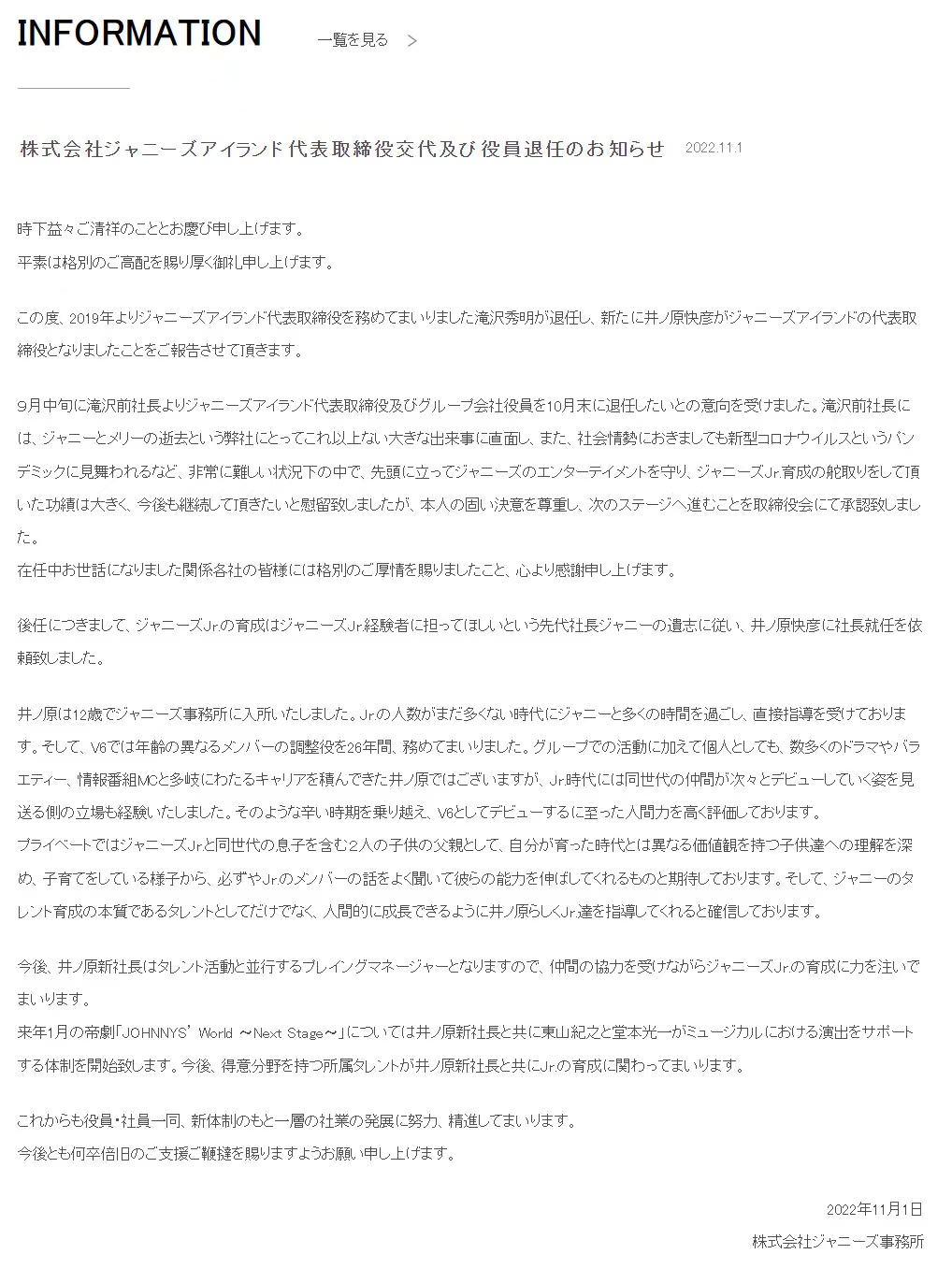 当地时间10月2日,日本杰尼斯事务所召开记者发布会,社长东山纪之、杰尼斯岛社长井之原快彦等出席,宣布事务所将在10月17日更名为SMILE-UP,专注负责赔偿事理。当日,杰尼斯发布公告宣布演员冈田准一将在11月30日退社。