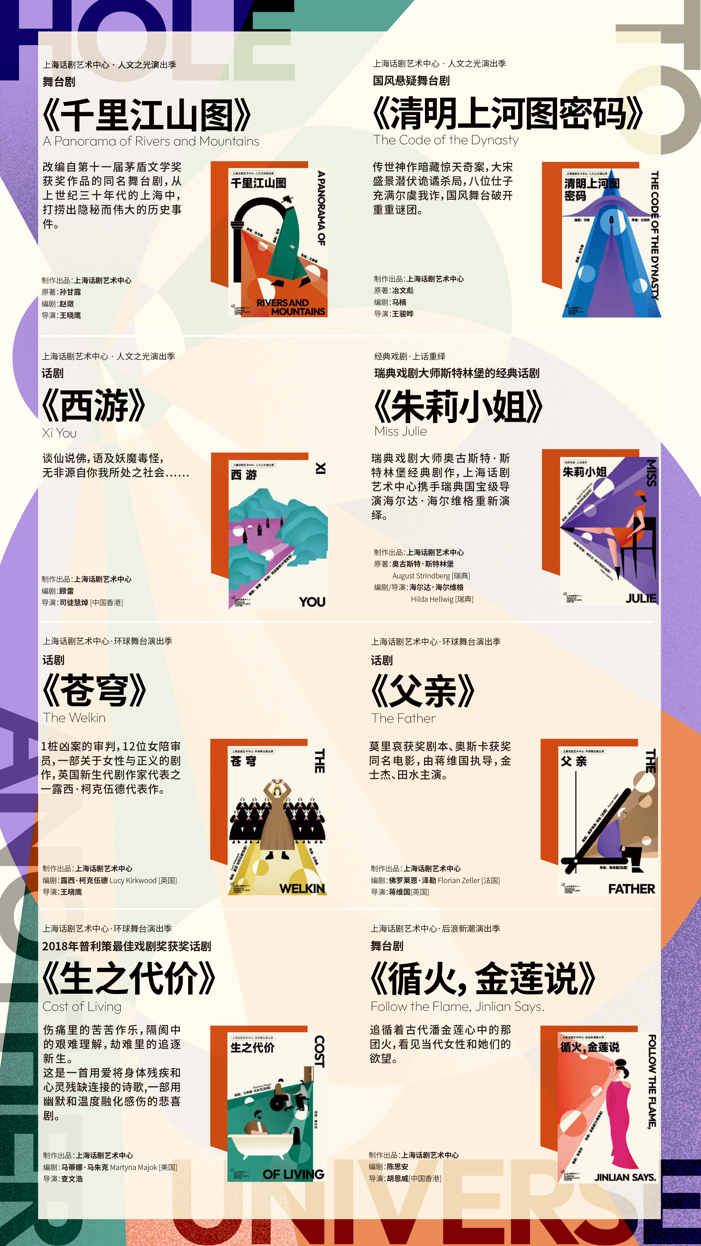 八大项目还包括瑞典戏剧大师斯特林堡的经典话剧《朱莉小姐》;英国新生代剧作家代表之一露西·柯克伍德代表作话剧《苍穹》;奥斯卡同名获奖电影、“莫里哀戏剧奖”最佳剧本中文版《父亲》;2018年普利策最佳戏剧奖获奖作品话剧《生之代价》;古典文学名著改编、当代视角演绎潘金莲故事的话剧《循火,金莲说》。