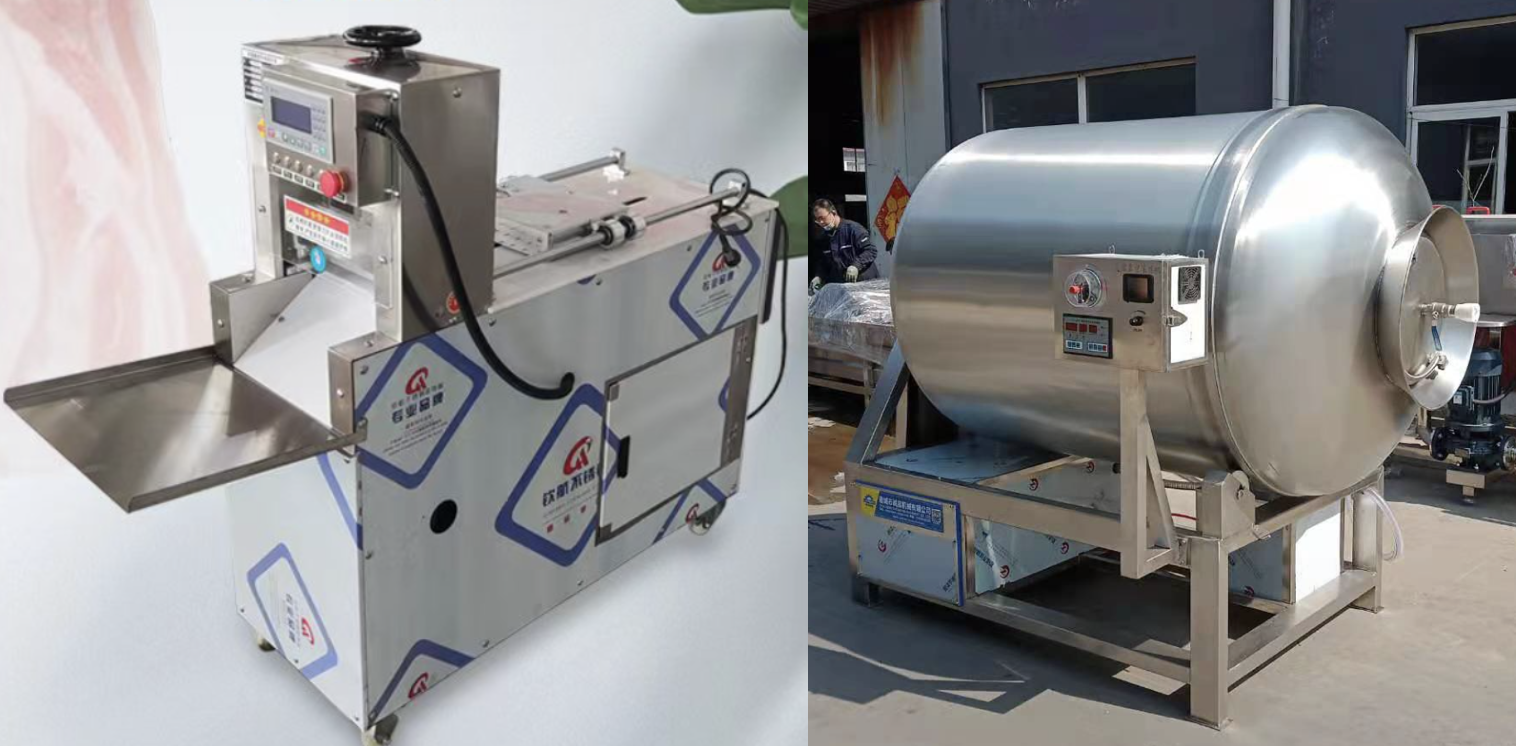 随后将处理好的肉放入模具和冷藏环境下贮存反应达8小时,而后推入冻库中速冻成型;以上步骤均完成后,使用切片机将冷冻肉块切片。