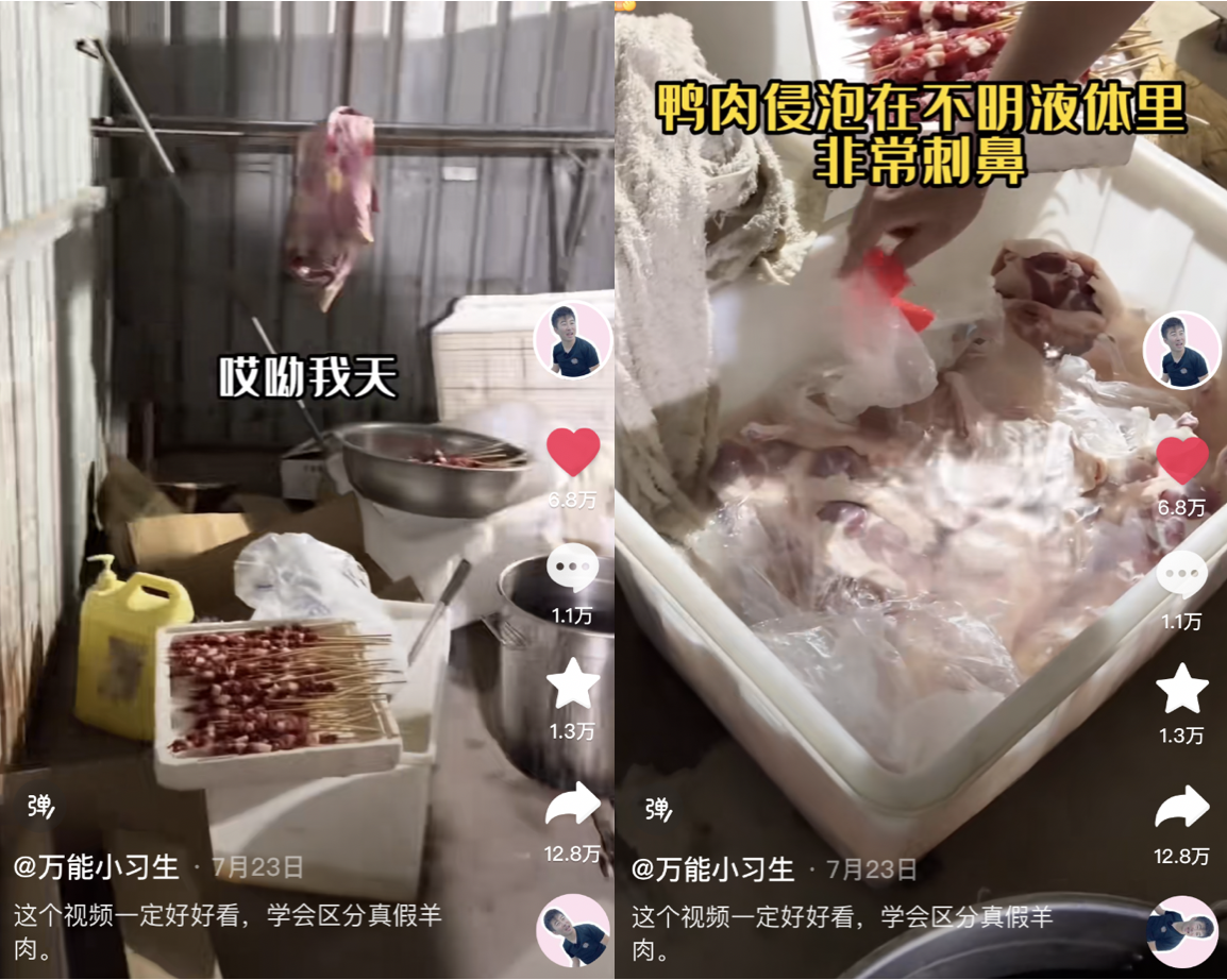 今年7月,短视频博主“万能小习生“在探访假羊肉串作坊时对方表示,来买肉串的一般都是“摆摊的、开小店的、景点的小摊小店,以及不靠回头客的外卖”。