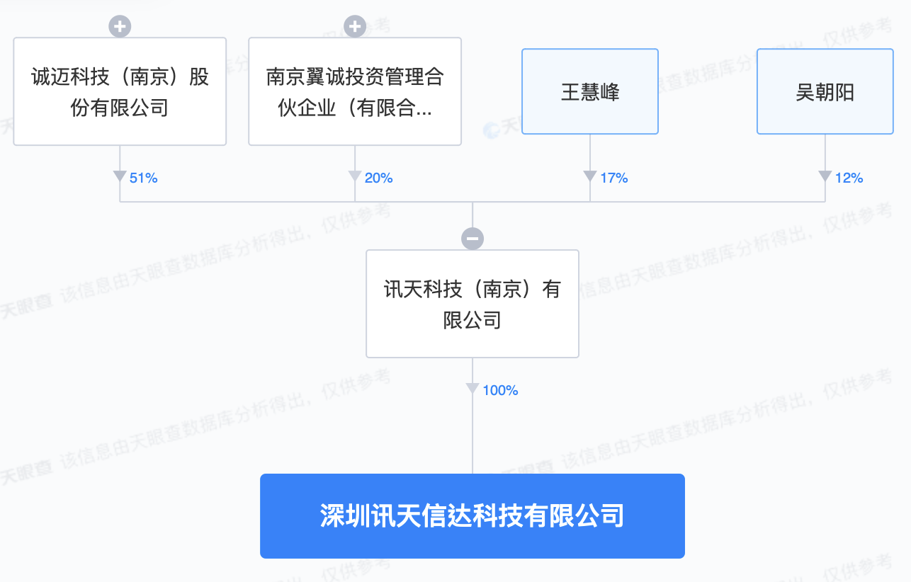 天眼查APP显示,近日,深圳讯天信达科技有限公司成立,法定代表人为孟磊,注册资本2000万元,经营范围包含:智能机器人销售;移动终端设备销售;人工智能应用软件开发;物联网技术研发等。天眼查股权穿透显示,该公司由诚迈科技旗下讯天科技(南京)有限公司全资持股。