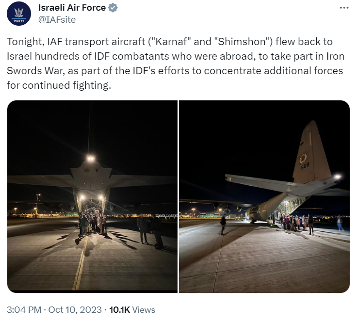 以色列空军10月10日在社交媒体平台X发文称,以空军运输机已将数百名在海外的以色列国防军战斗人员空运回国,旨在“集中更多兵力继续战斗”。