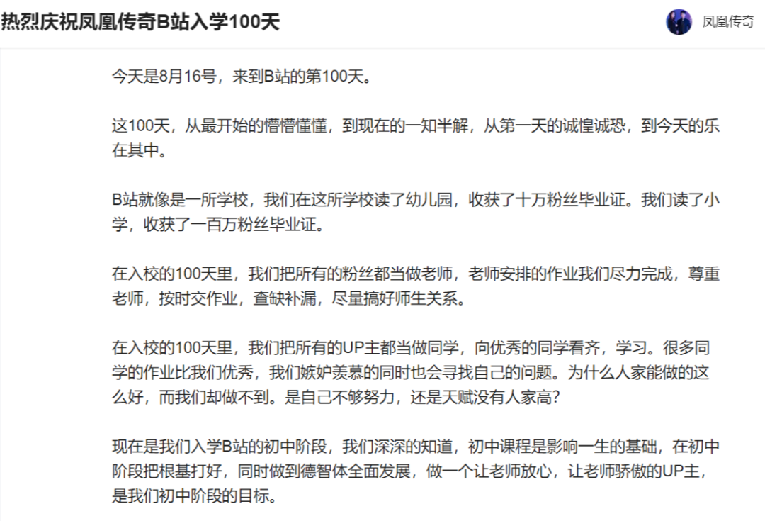 凤凰传奇与很多入驻B站后就消失不见的明星账号不同,他们的团队实打实地重视这个年轻人活跃的社区。入驻B站100天后,凤凰传奇还以学生的口吻,专门写了一篇小作文,称B站的观众为老师,虚心向大家请教。
