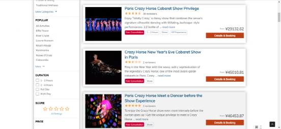 票价在不同网站有显著差异。疯马官网显示最低票价为180欧元(约1400人民币),根据演出内容的不同和节假日调整。票价最高的是450欧元(约3500人民币)的“疯狂新年”主题秀。
