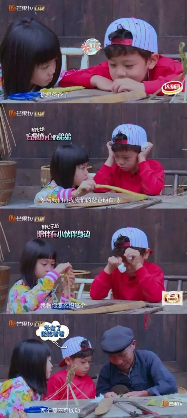 在孩子们单独离开爸爸做任务的时候,庆庆想爸爸,考拉会特别耐心地劝慰她~还教他怎么编篮子,来分散他的注意力~