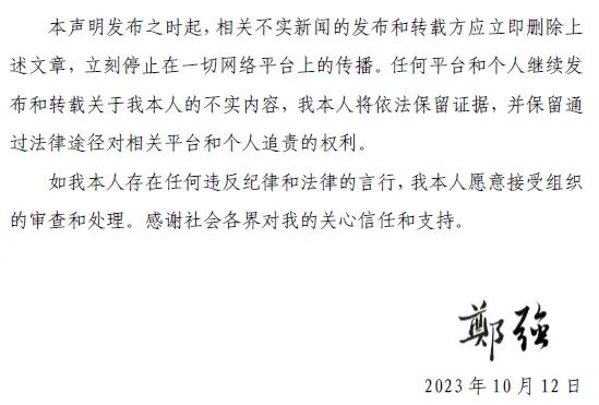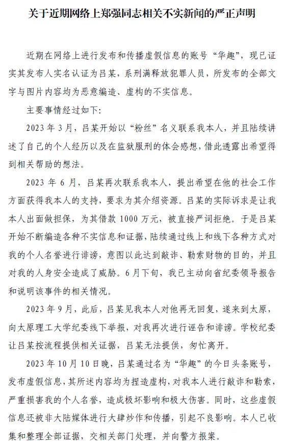 10月12日,“郑强教授”微信公众号发布声明:近期在网络上进行发布和传播虚假信息的账号“华趣”,现已证实其发布人实名认证为吕某,系刑满释放犯罪人员,所发布的全部文字与图片内容均为恶意编造、虚构的不实信息。同日,北京中伦文德太原律师事务所接受郑强教授委托发表声明,将依法予以维权。