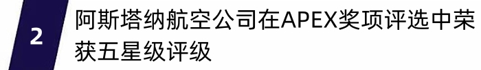 2023年9月20日,阿斯塔纳航空公司在世界航空旅客体验协会(APEX)于洛杉矶举行的颁奖典礼上,荣获主要航司类别的五星级评级。这是阿斯塔纳航空公司第九次获奖。“APEX奖项是阿斯塔纳航空机上服务卓越质量的衡量标准,也是对旅客体验持续改善的肯定。”阿斯塔纳航空机上服务副总裁Yelena Obukhova表示:“我们感谢同事们的专业精神和对高水准服务标准的承诺与投入,也感谢乘客们给予的积极反馈。”