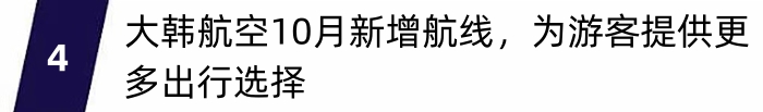 近日,大韩航空宣布将在即将来临的冬季航班期间,恢复并开通更多航线班次,覆盖中国、日本、东南亚、大洋洲和美洲等地区。其中,上海至釜山、厦门至首尔将自10月29日起每周运营7班;昆明至首尔航线将自11月19日起每周运营4班。除中韩航线以外,大韩航空也持续扩充更多国际航线。自11月26日起,大韩航空开航首尔仁川至越南富国岛的定期航班,每周执行7班;首尔仁川至日本东京的航线将增至每日4班;首尔仁川至日本名古屋的航线则将增至每周17班。据悉,大韩航空日后将根据航空市场动向和乘客出行需求稳步恢复和扩大全球航线网络,并带给乘客更加舒适、便捷的出行体验。