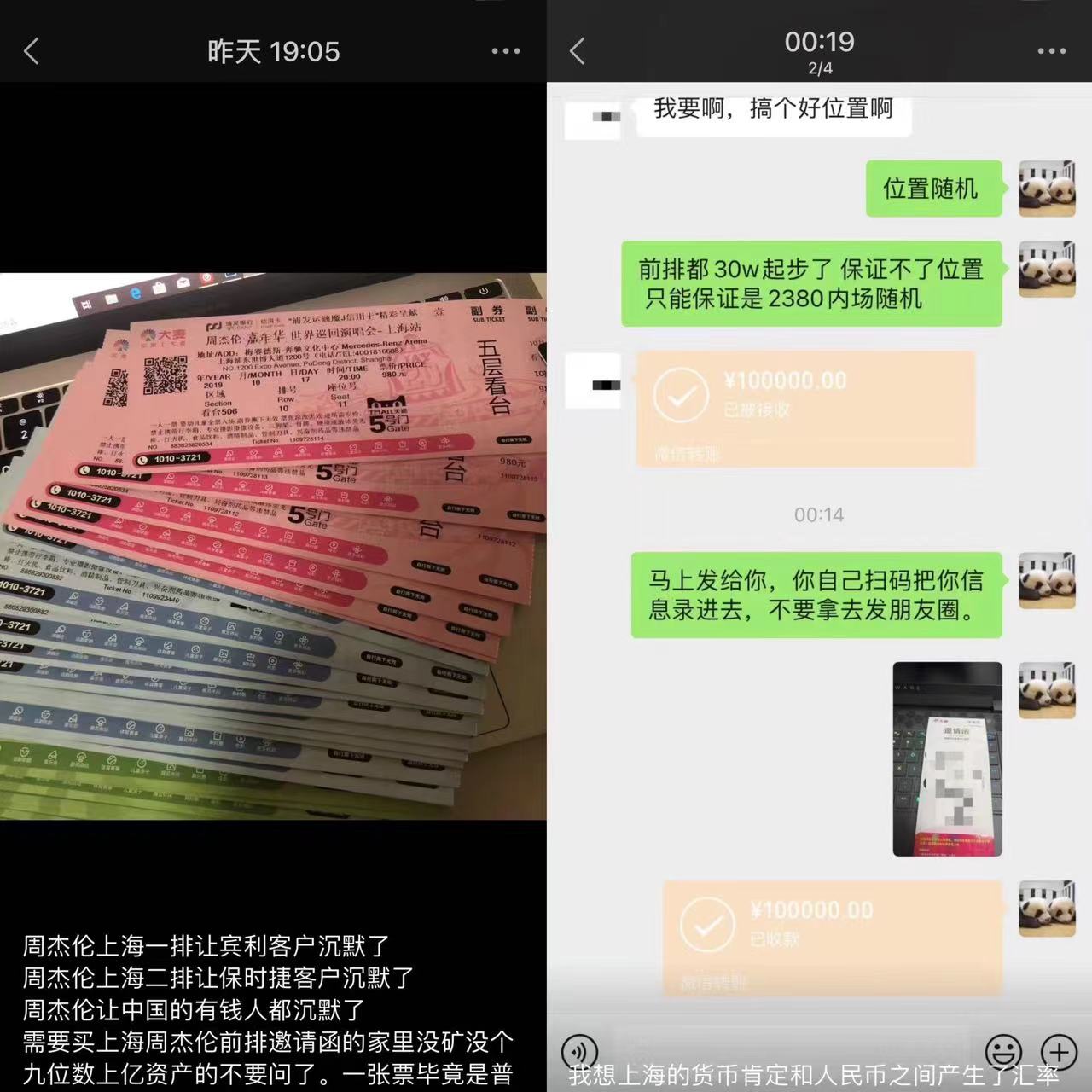 昨晚他更新了朋友圈,一位粉丝以10万元的价格买下了一张原价2380元内场票,位置随机。“上海的货币肯定和人民币产生了奇妙的汇率关系。感谢大家的支持!”黄牛C半是兴奋半是调侃地说。
