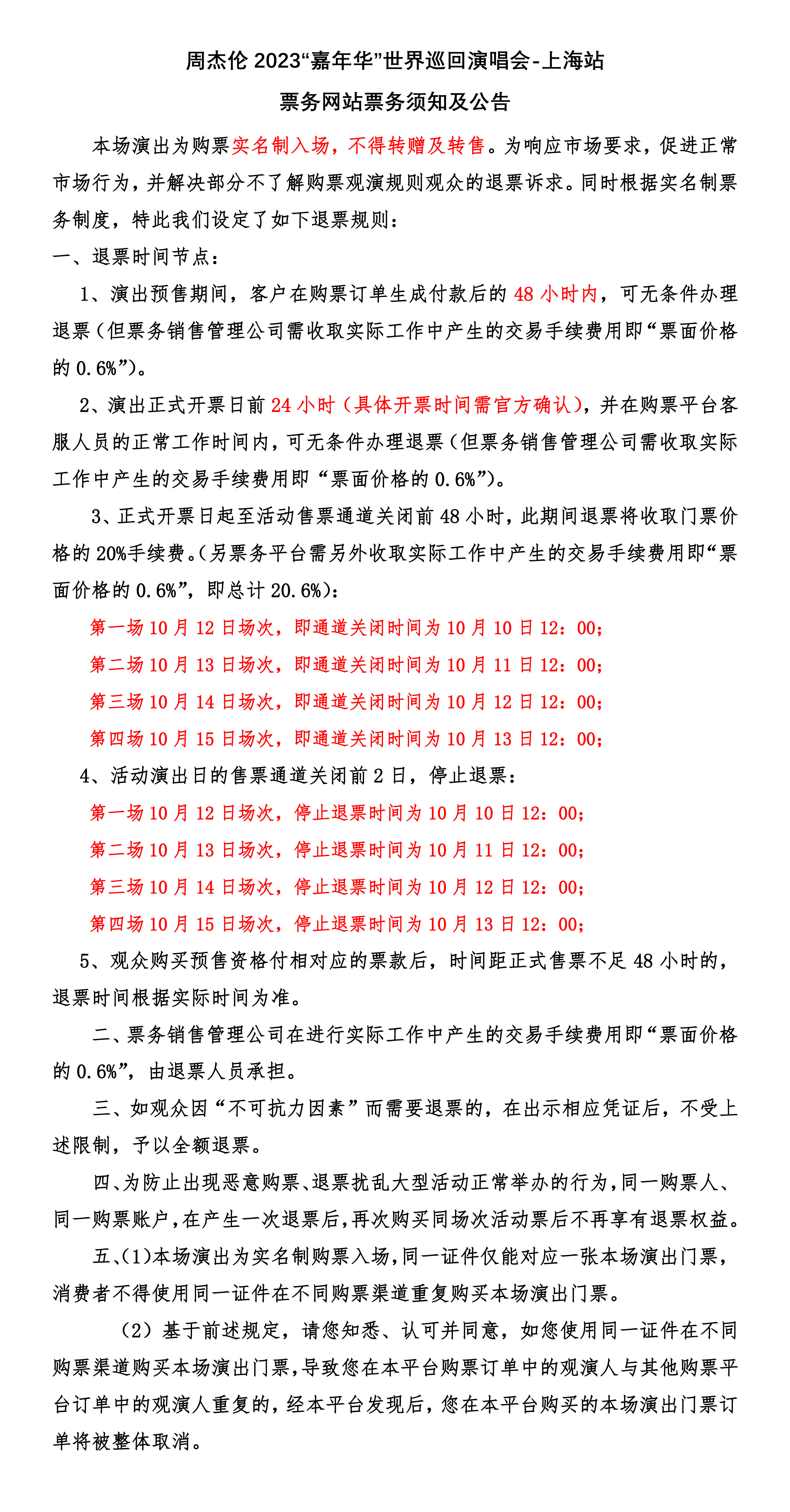 与周杰伦天津场演唱会不同,本次上海演唱会采取强实名制,购票人、门票、身份证件需保持一致。根据票务平台发布的公告,此次周杰伦演唱会门票可退,但不得转赠及转售,演出开始前48小时停止退票,每个身份证仅可购买一张门票。