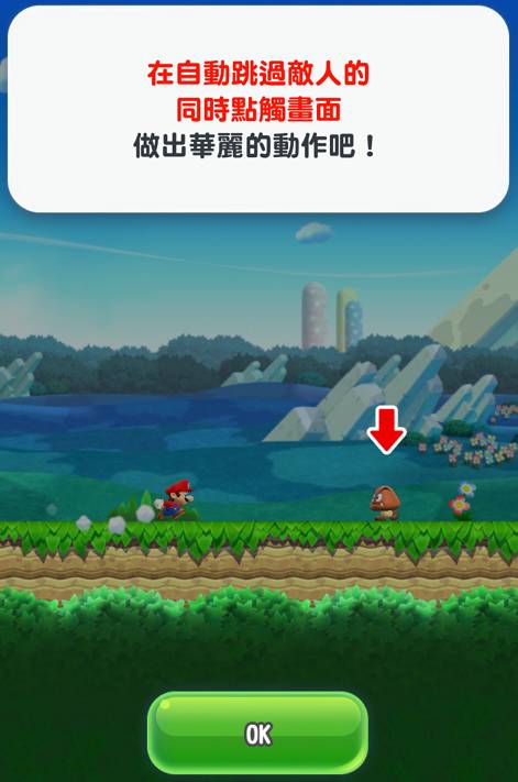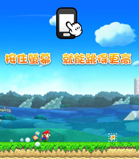 游戏的操作很简单,因为是个跑酷游戏,马里奥是自动向前冲的,只要轻点屏幕马里奥就会跳起来,点屏幕的时间越长马里奥跳起来的距离会越高~