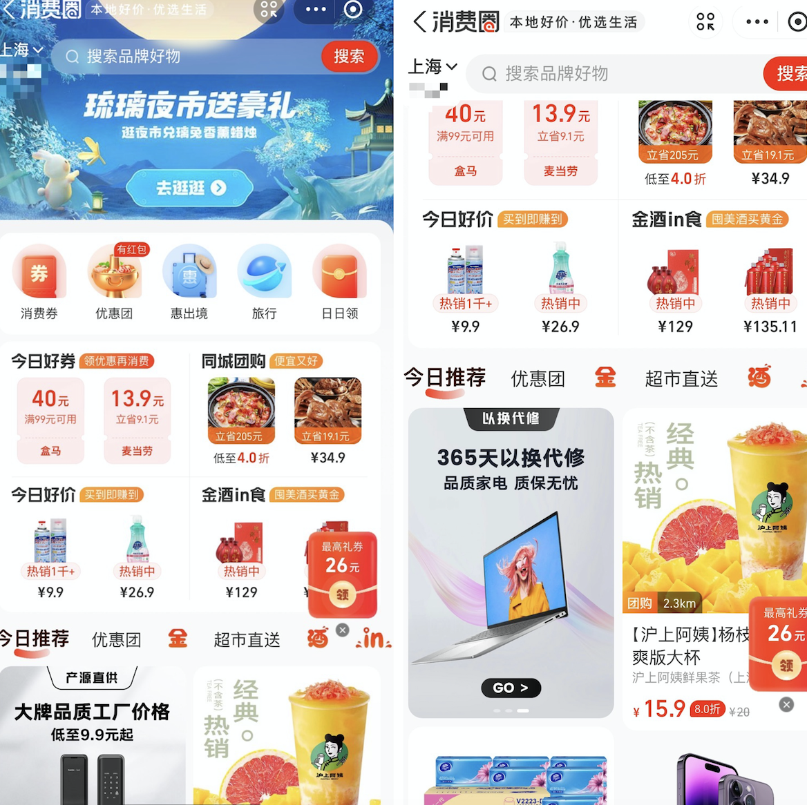消费圈界面包含的类目众多,有“消费券”、“优惠团”、“惠出境”等分类。除了同城餐饮类团购,还有“超市直送”这样的即时零售业务,此外也包含普通电商和直播,但没有外卖业务。