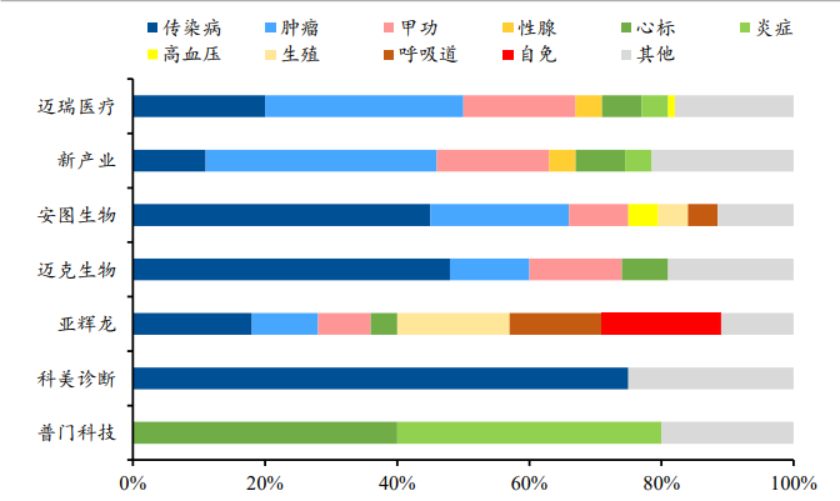 具体到试剂种类和各家公司,国内市场中,肿瘤、传染、甲状腺功能、激素等常规项目占据70%以上的份额。其中,国产玩家在传染病领域的布局较多,安图生物营收位居第一。本次集采也意味着将进一步加速该领域的国产替代进程。同时,其总体市场增速可能减缓。
