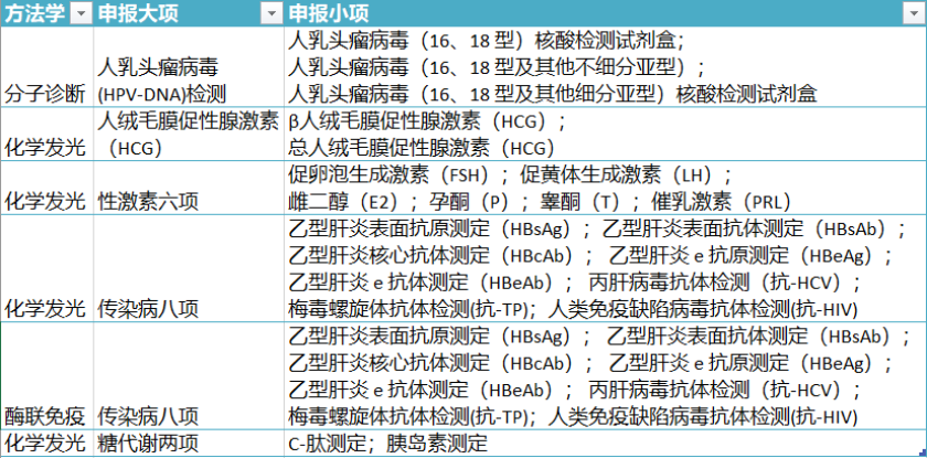 本次集采的品种大多集中在化学发光领域,包括人绒毛膜促性腺激素(HCG)、性激素六项、传染病八项、糖代谢两项。另外还包括分子诊断领域的人乳头瘤病毒(HPV-DNA)检测,以及酶联免疫领域的传染病八项。
