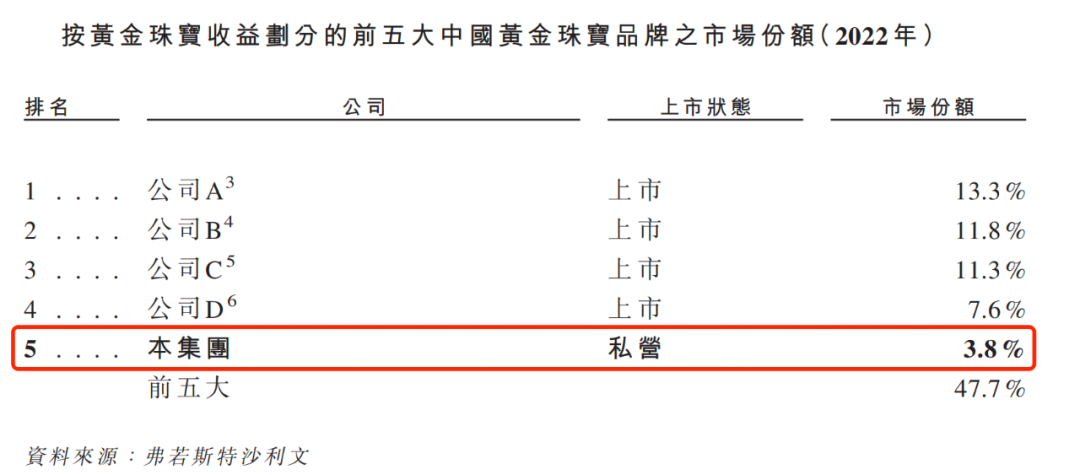 据弗若斯特沙利文数据,2022财年,中国五大黄金珠宝品牌的黄金珠宝收益共约1954亿元,占整个市场的47.7%。其中,梦金园排名第五,所占份额为3.8%。