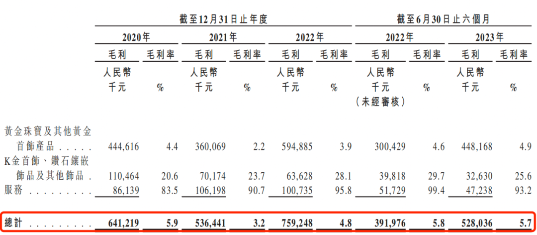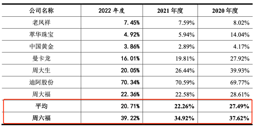 2023年6月29日,同行公司周六福再次在深交所主板更新了招股说明书。招股书显示,2020年-2022年,周六福的毛利率分别为37.62%、34.92%、39.22%,远超梦金园5%左右的毛利率水平。