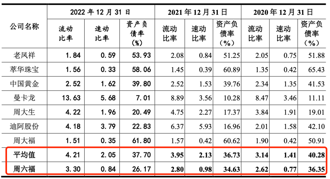 2020年-2022年,周六福的资产负债率分别为36.35%、34.63%、26.17%,只有梦金园的一半左右。此外,根据周六福招股书数据,同行可比上市公司的资产负债率均值分别为40.28%、36.73%、37.70%,同样远远低于梦金园。