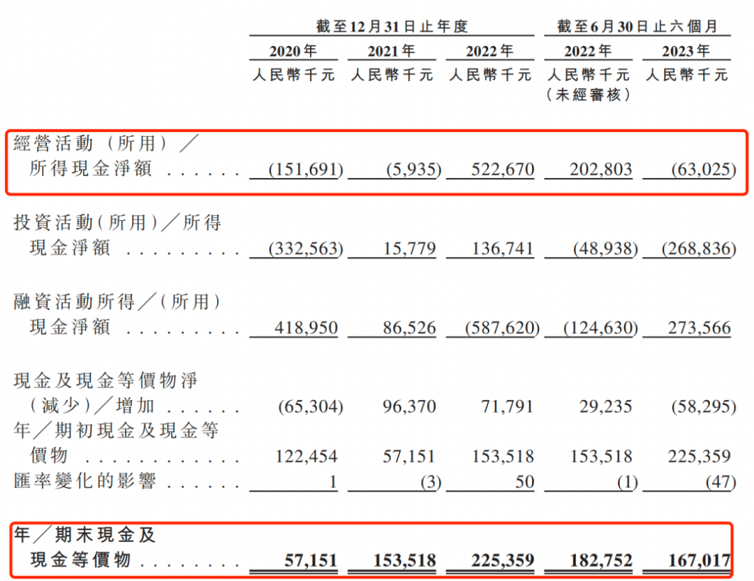 此外,公司的经营活动所得现金净额也长期净流出,报告期内,这一数据分别为-1.52亿元、-593.5万元、5.23亿元、-6302.5万元,除2022年为正外,其他年份均为负。