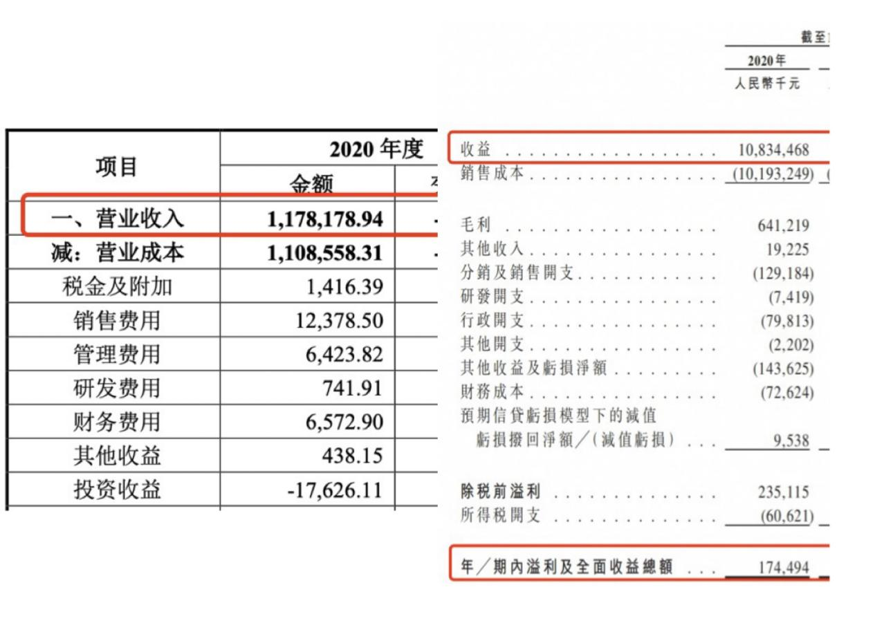 2021年6月21日,梦金园在深交所主板递交的招股书中,公司2020年的营业收入为117.82亿元,而在港交所递交的招股说明书中,营业收入变为了108.34亿元,相差将近10亿元。