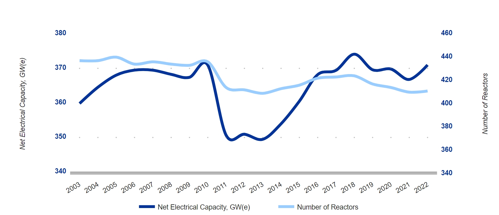 据国际原子能机构(IAEA)数据,全球核电装机容量在2011年同比下滑5.5%至351 GW,但从2014年开始逐步回升,到2018年达到374 GW,超越了2010年的371 GW,之后有所回落,到2022年全球核电装机容量再次增加,截至年末约为371 GW。