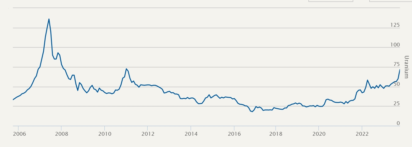 此外,卡梅科公司在9月初宣布,由于其雪茄湖和基湖铀矿的生产存在一定挑战,将下调2023年全年产量预测。