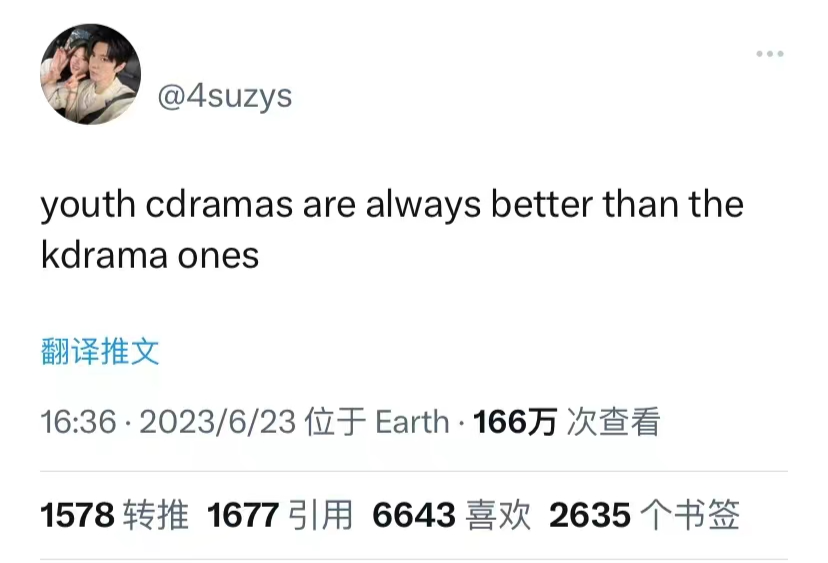 在国内主流观众已经鲜少沉迷青春偶像剧的当下,海外的推特、tiktok、ins等平台上热爱中剧的观众在不知不觉中形成了庞大的规模,并诞生了大批搬运、剪辑博主,通过发布国产剧短视频收获大量转赞评,甚至时常有分不清中剧与韩剧的博主,将国产剧的剪辑作品误打上「kdrama」的标签。