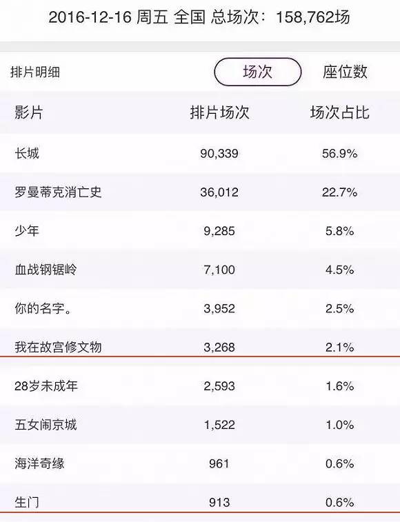“大家最初的想法可能都一样:有《长城》在这儿,其它片子不敢来,咱们就有一点机会。” 戴年文说。真正让他感到诧异的,反倒是敢于与《长城》对战的《罗曼蒂克消亡史》,“给其它片子造成了很大压力。”