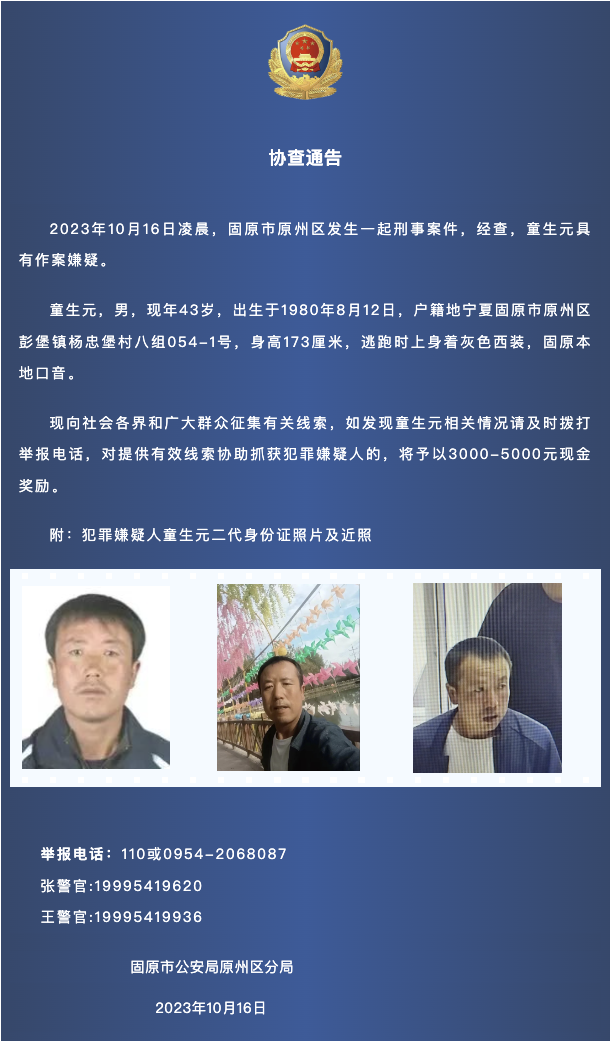 “平安原州”微信公众号消息,10月16日凌晨,固原市原州区发生一起刑事案件,经查,童生元具有作案嫌疑。现向社会各界和广大群众征集有关线索,如发现童生元相关情况请及时拨打举报电话,对提供有效线索协助抓获犯罪嫌疑人的,将予以3000-5000元现金奖励。