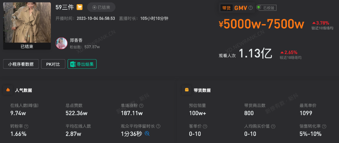 就是这种让很多人直呼没见过的带货方式,让“郑香香”账号10月4日单场带货GMV高达5000万-7500万,单场平均在线人数达2.87万,单场涨粉187.11万。