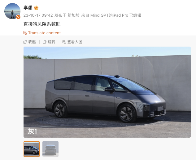 10月17日,理想汽车CEO李想通过其个人微博晒出旗下MPV车型MEGA的造型图片,并配文称:“直接猜风阻系数吧。”据悉,理想MEGA为理想首款纯电架构下的车型,将采用800V高压平台,搭载5C麒麟电池。